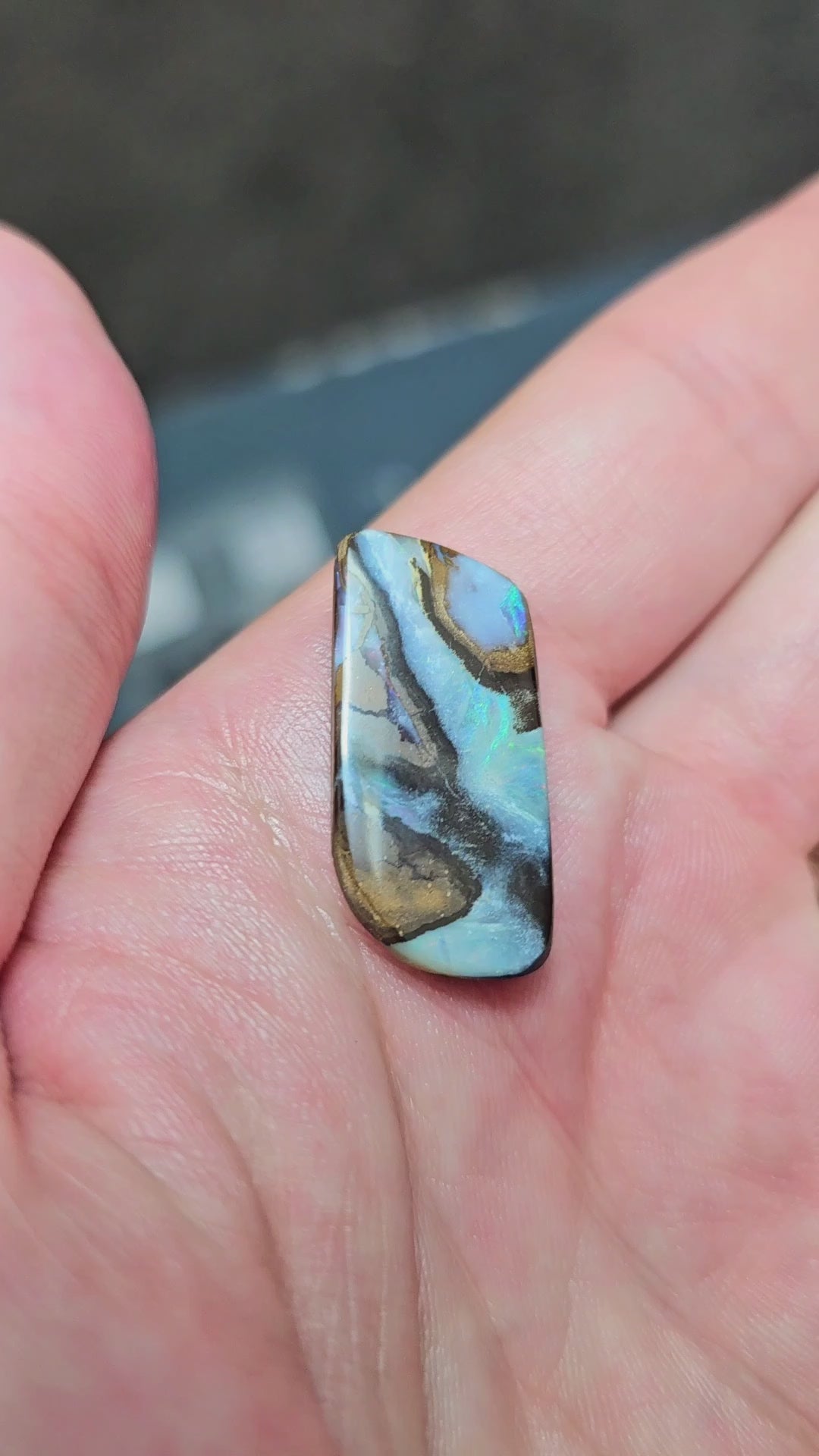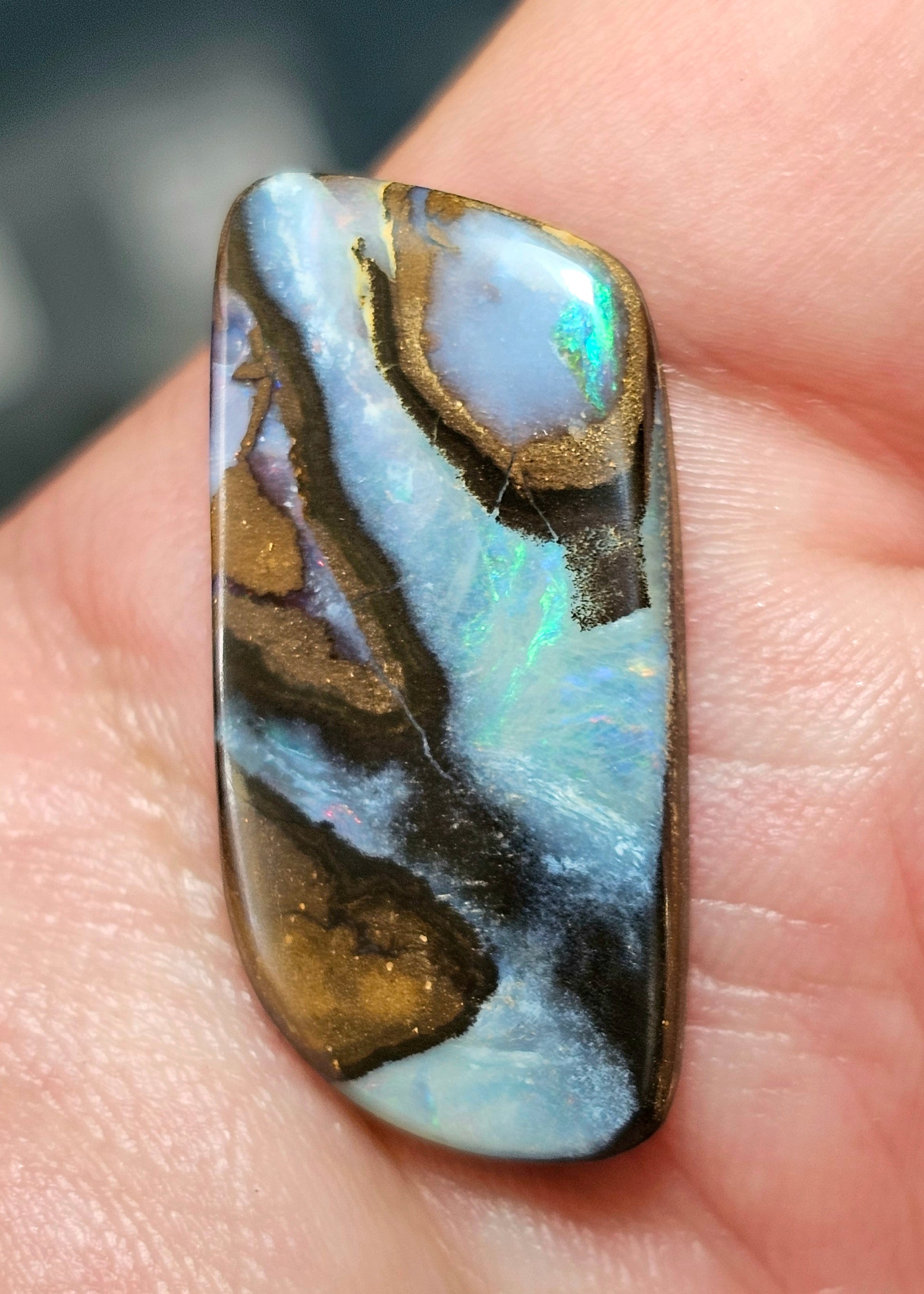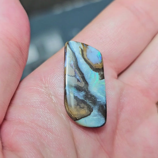Queensland Boulder Opal with a lovely pattern and a bit of green colour in the crystal. Check out the video to see the colour play!