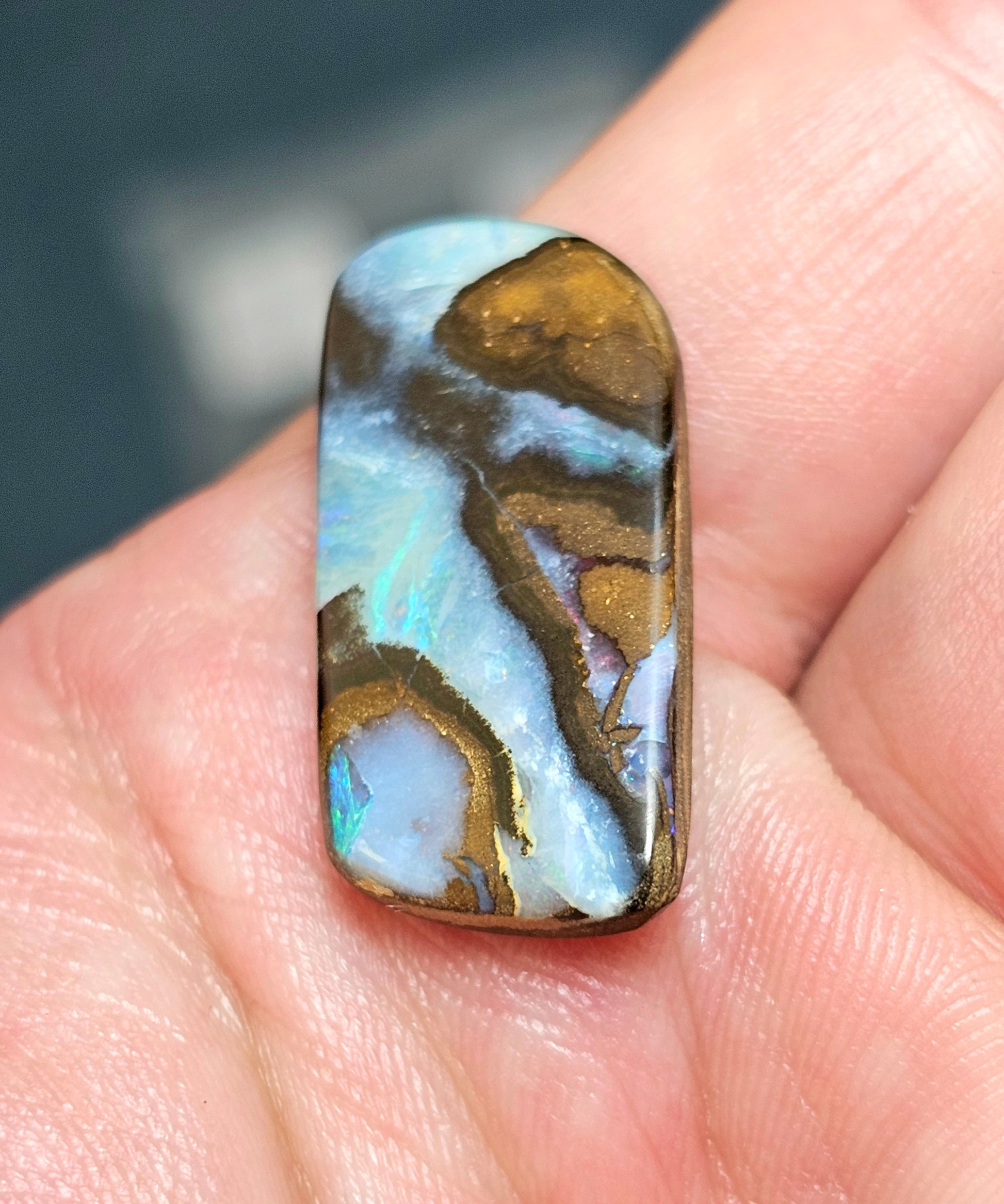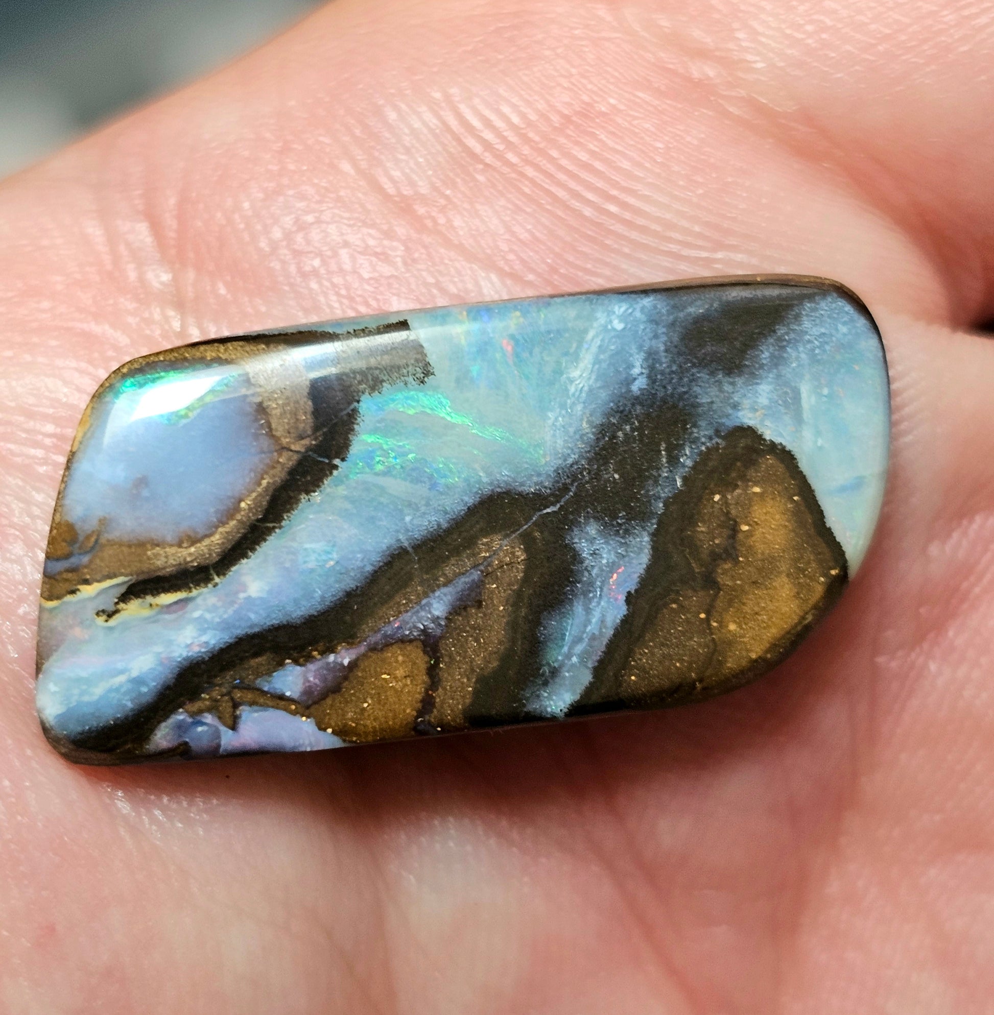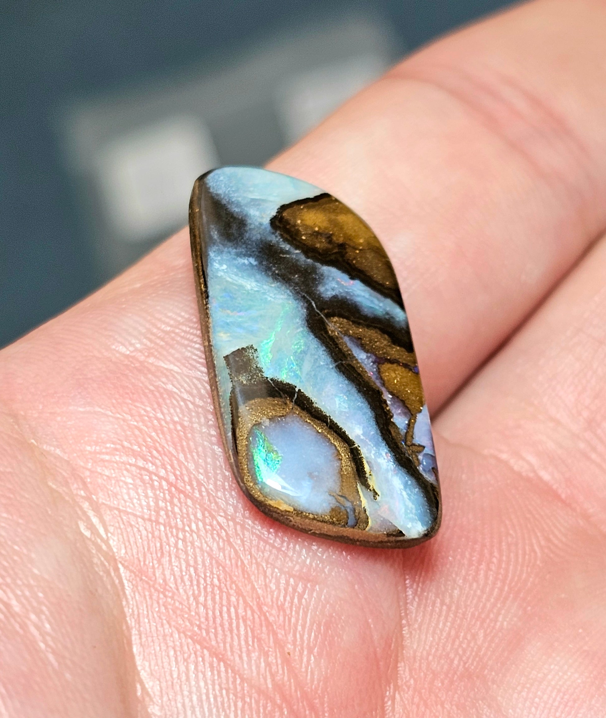 Queensland Boulder Opal with a lovely pattern and a bit of green colour in the crystal. Check out the video to see the colour play!